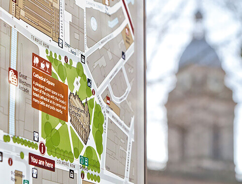The bespoke totem design which is installed throughout the City of Birmingham for Centro and partners. Featuring digital printed LED back-illuminated heads-up mapping and highly contemporary aesthetics.