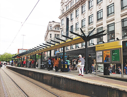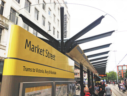 Trueform have provided a full turn-key service to Metrolink on the new Market Street tramstop platform canopies including full design, manufacture and erection. The architectural canopies have many features, including Real Time Passenger Information, illuminated advertising displays and elegant laminated glass roof canopy structure.